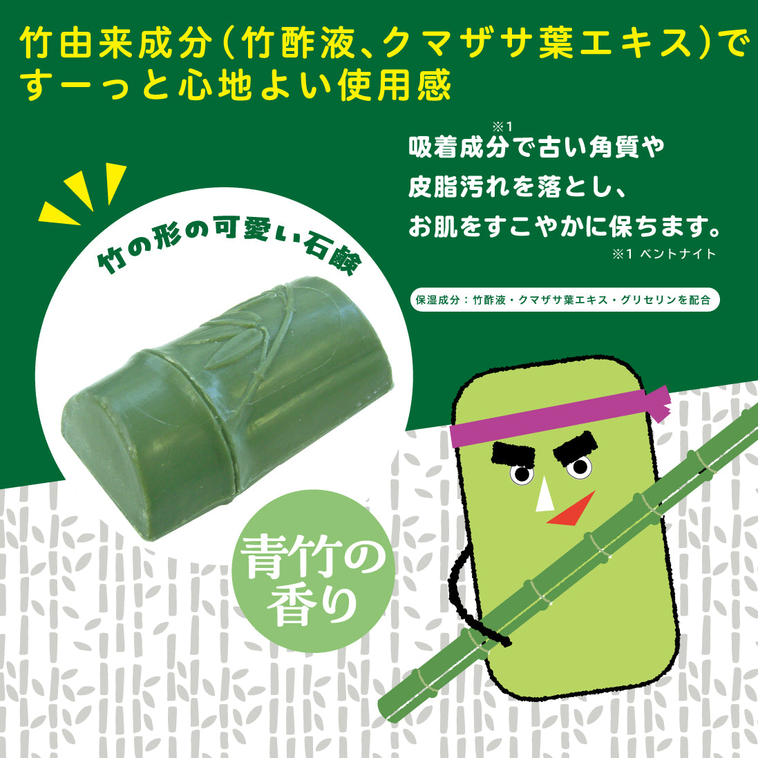 成分 石ケン素地、グリセリン、タルク、ベントナイト、竹酢液、クマザサ葉エキス、水、エタノール、エチドロン酸4Na、香料、酸化鉄、グンジョウ